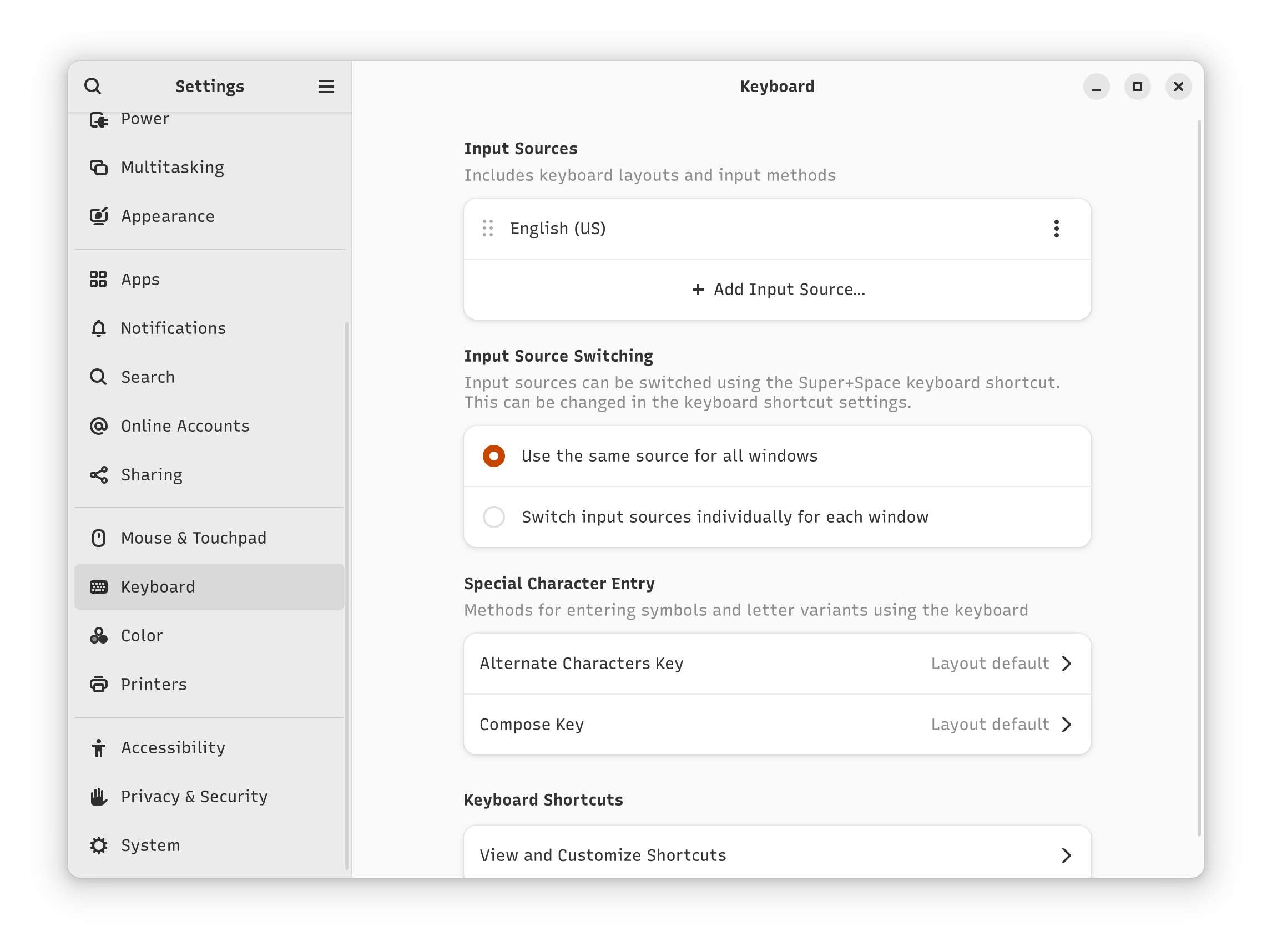 2. Click “Keyboard“ in the sidebar, and under “Input Sources”, click “Add Input Source…“.