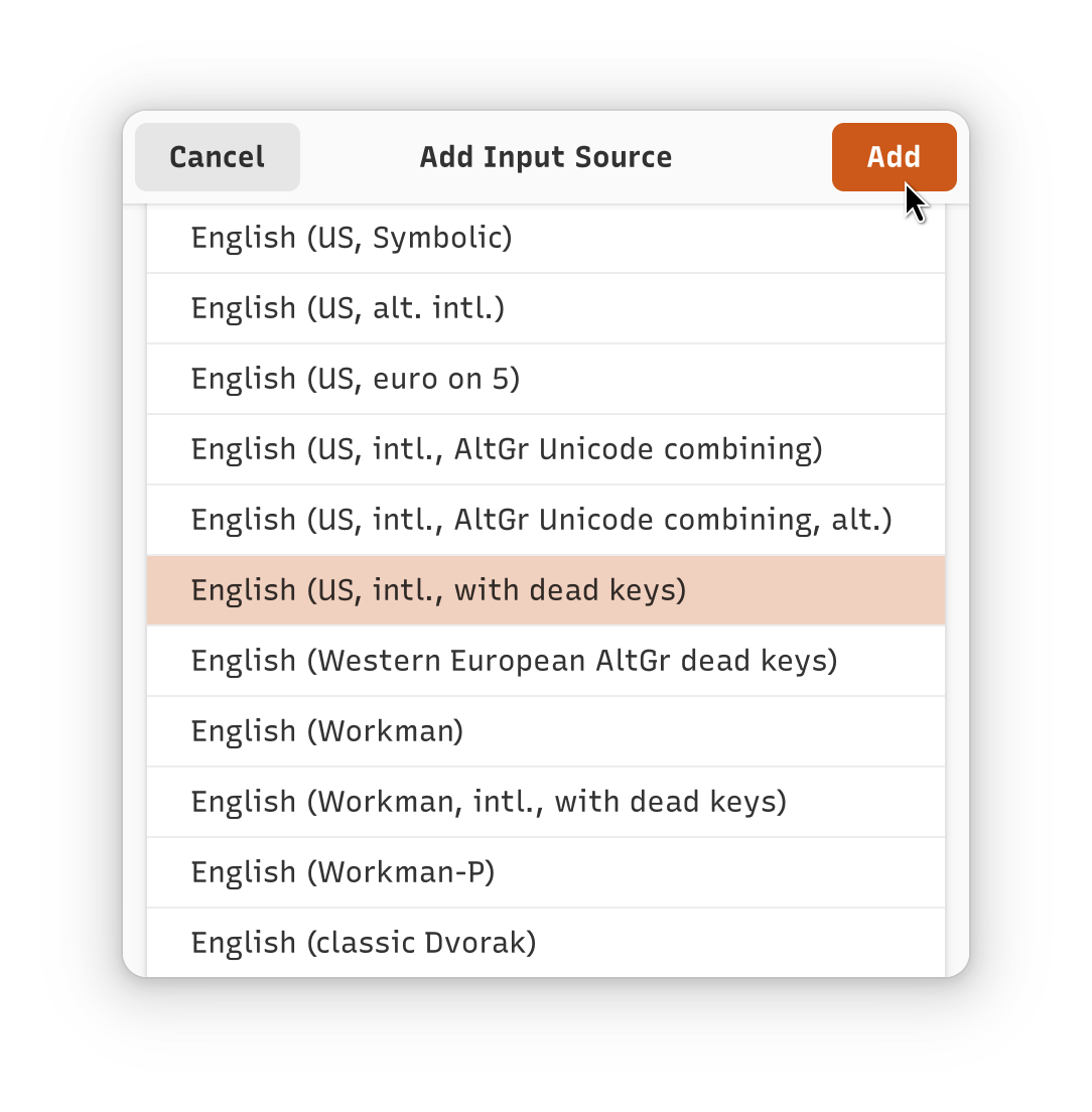 4. Select “English (US, intl., with dead keys)“ and click “Add”.
