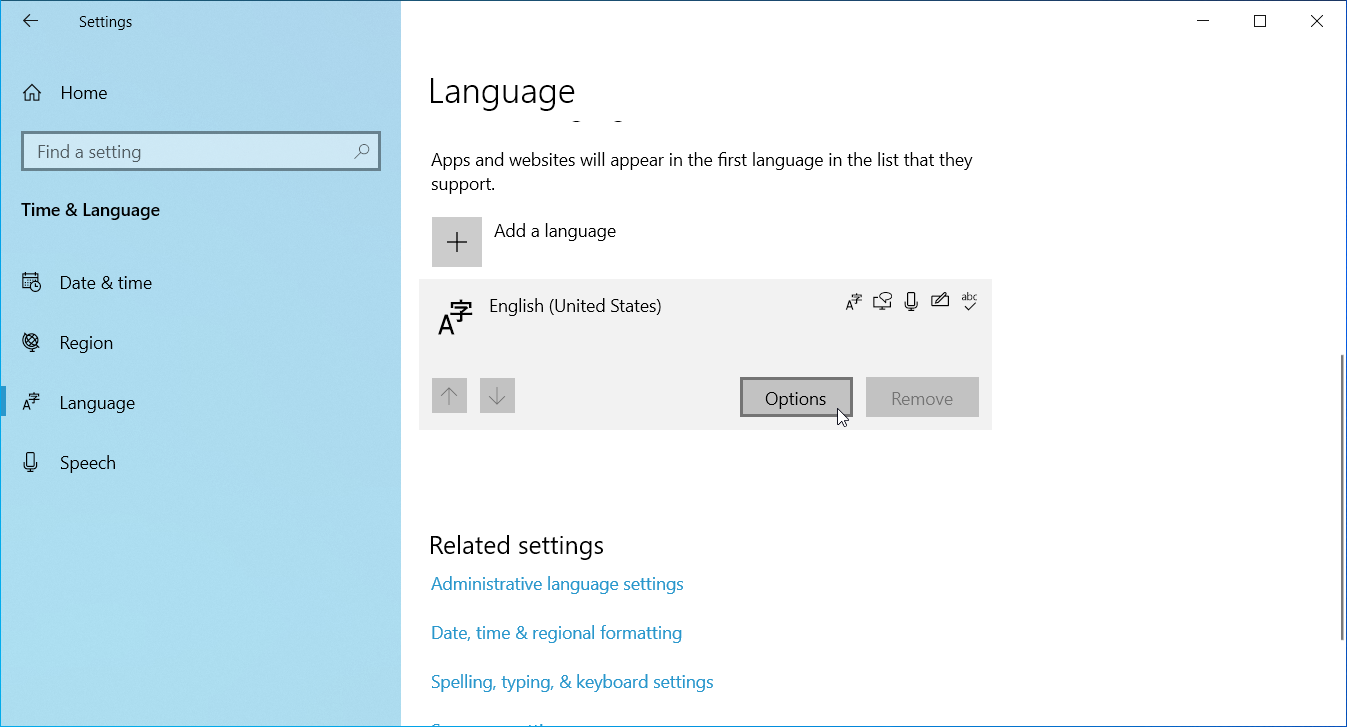 If you don't have “English (United States)”, you can add it using “Add a language”.